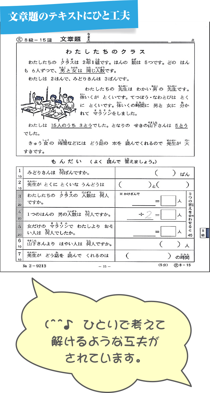 長文の文章題なども取り入れ、読み取りを重視したテキストです。学校の教科書、市販の問題集、今お通いの塾のプリントと比べてみてください。問題の工夫が 一目瞭然です。